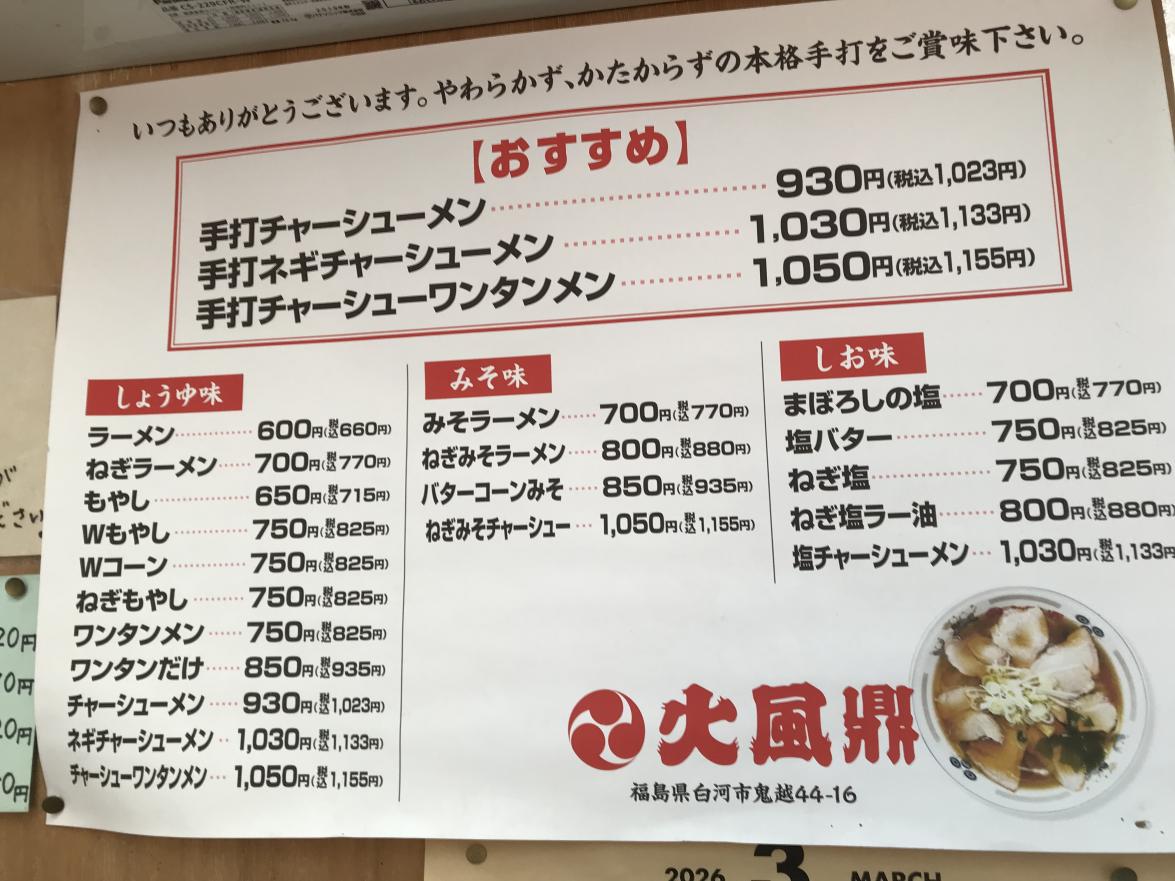 ラーメンを食べに白河に行ってきました。 人気のラーメン店を調べて、その中で 火風鼎と言う店に行きました。1 時過ぎに ついたら、10人ぐらい並んでいました。 ラーメンを注文しました。麺は自家製の 手打ち麺で、コシがあってあってとても おいしかったです。