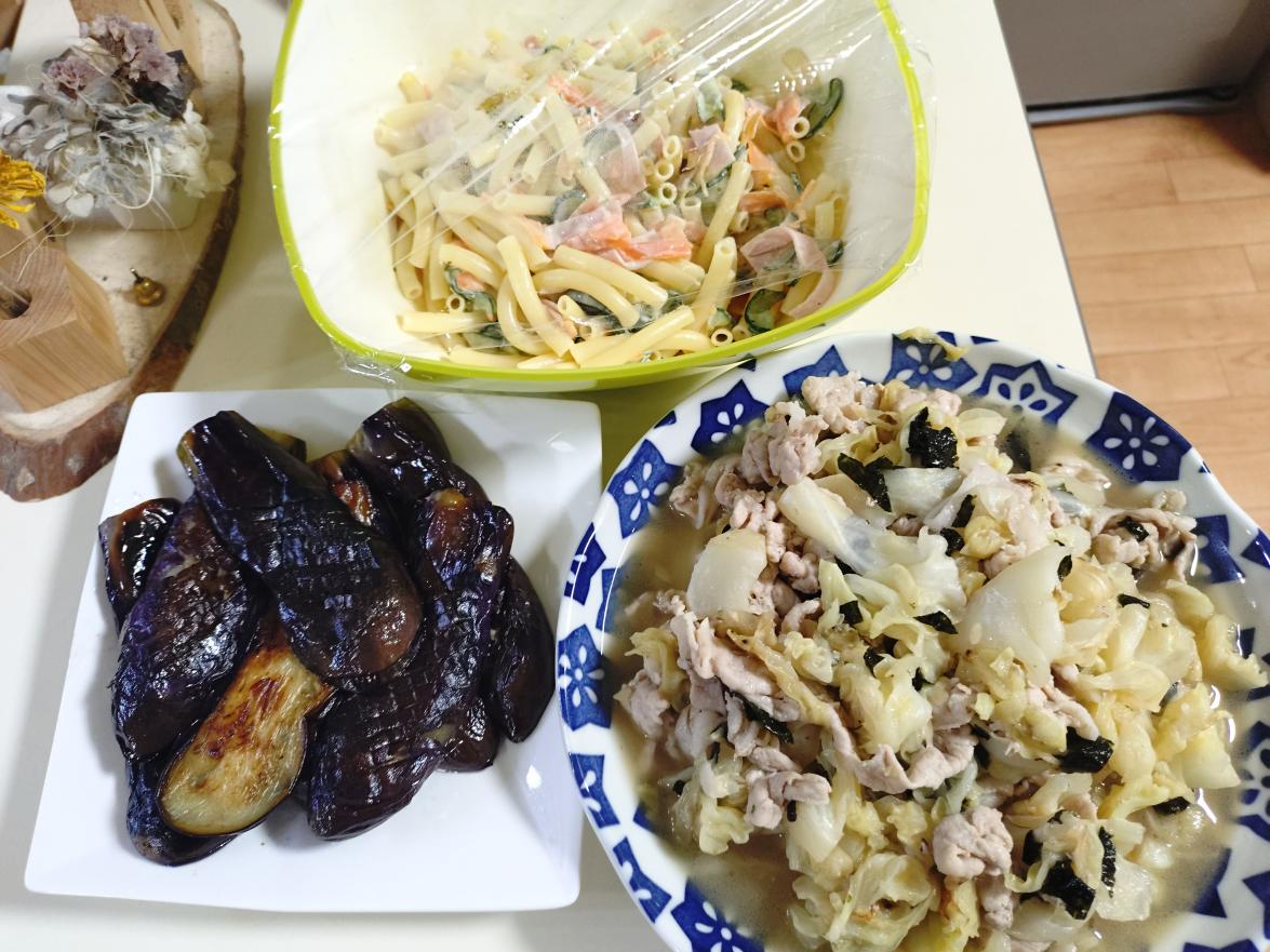 2025.09.28 妻からリクエストがありまして、マカロニサラダを作って欲しいと…。あと、娘が食べたそうにしてるナスのステーキがイイと言うことで作りました!ただ、メインがないので、クラシルか何かで調べたら、キャベツの青のり炒めが出てきたので作りました💡。サラダはキュウリはカット後塩揉みして混ぜたので、塩味の塩梅がよくできました!